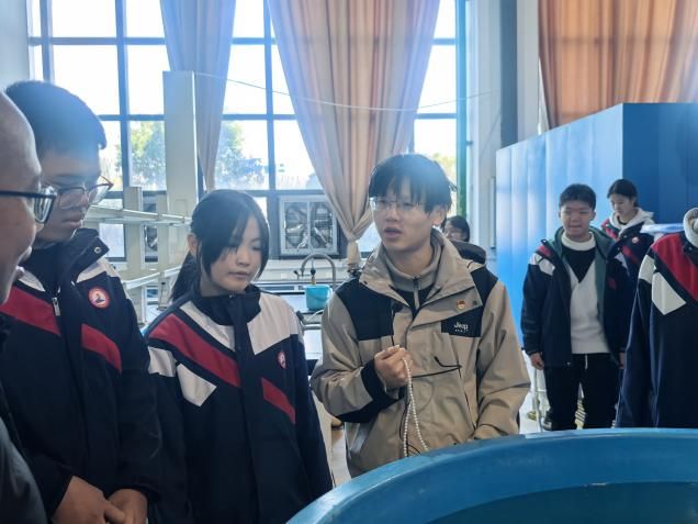 研究生党员耿昌盛、入党积极分子周斌杰带领师生参观了中试养殖基地,对依托于智能化循环水系统的蟹公寓以及各种规格养殖桶进行了详细介绍,并对麻豆成人