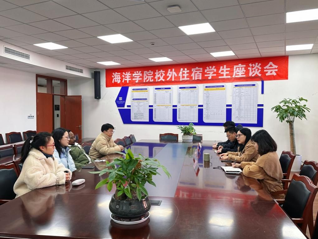 在竺银康楼303会议室举行校外住宿学生座谈会。学院党委副书记张乐、学工办辅导员与4位校外住宿学生参会。