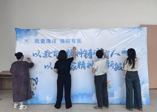 在印着 “教育家精神铸魂育人,以科学家精神创新报国” 的喷绘签名墙前,老师们郑重落笔。每一个签名都是一份承诺,是对教育使命的坚守,更是对海洋学科育人初心的笃定,让精神信仰在笔墨间代代相传。