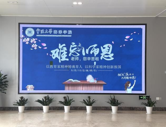 东楼背景屏上,“以教育家精神铸魂强师,谱写教育强国建设华章”“老师,您辛苦了!” 等标语格外醒目。柔和的灯光与暖心的文字交织,将尊师重教的氛围延伸至校园每个角落,既让教师感受到节日的礼遇与尊重,也在潜移默化中引导学生厚植敬师爱师情怀,为学院营造了良好的育人环境。