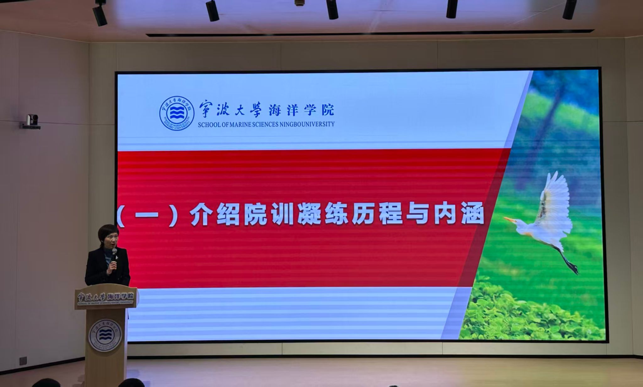 学院党委书记邵丽详细介绍了院训凝练历程与内涵。她指出,当前的海洋学院肩负着重大战略使命,比以往任何时期更需要树立一面精神旗帜,为思想定向,以文化赋能。她强调,历经一年多的征集、评选与凝练,“厚德求真 探海拓新”八字院训承载着全院师生校友的智慧与期盼,从立院之本、治学之基、兴院之道、强院之魂四个维度有机构建起学院特有的精神坐标,期盼全院师生共同践行院训精神,在服务国家战略和区域经济社会发展的征程中,书写属于宁大海洋人的生动篇章。