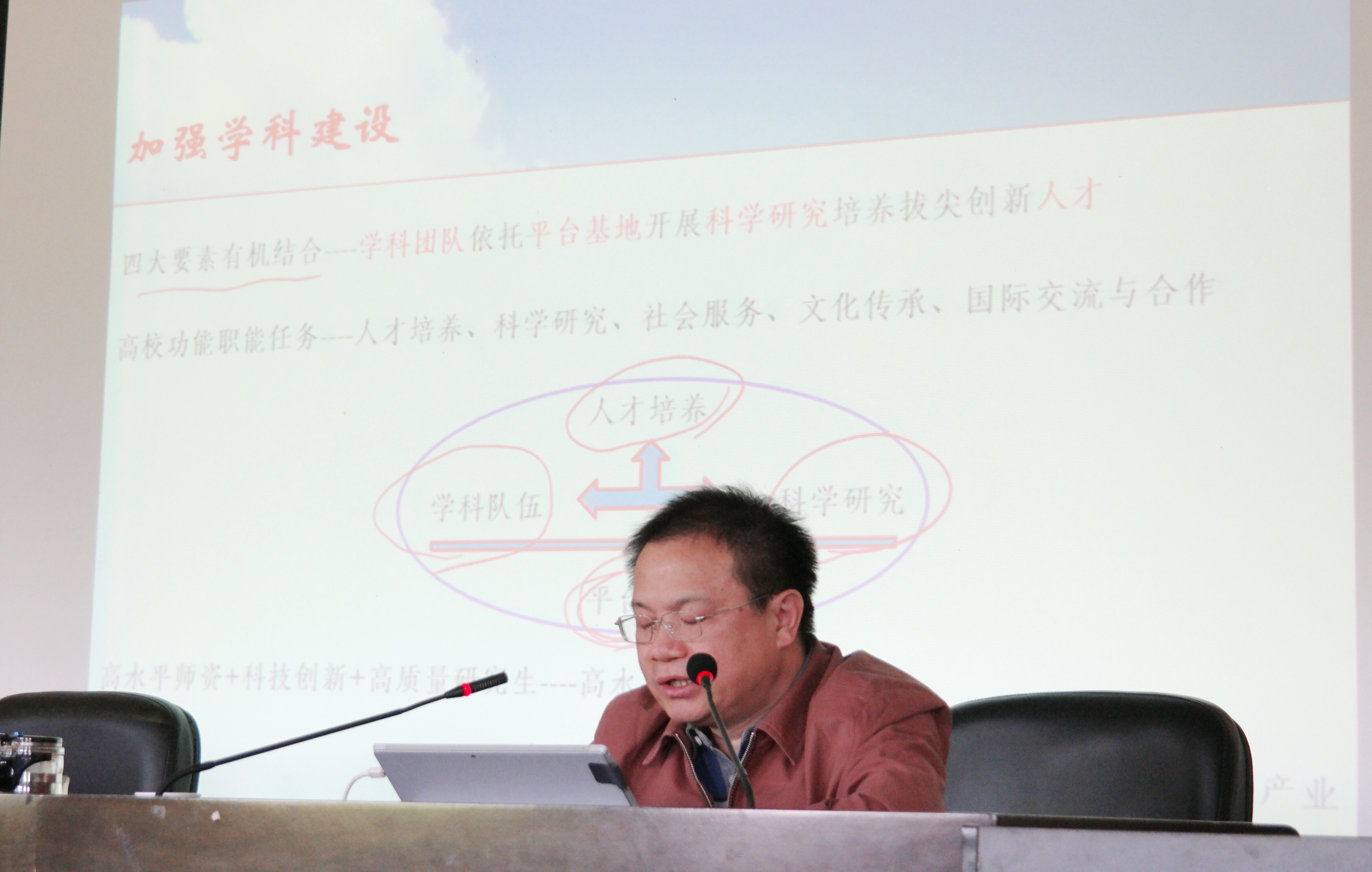 的学科发展情况,指出了优势和不足,强调要进一步彰显优势,补齐短板。欧处长就如何加强学科建设提出了重要指导意见,分别从学科队伍建设、平台建设、人才培养、科学研究等方面做了详细阐释,并提供发展思路。
