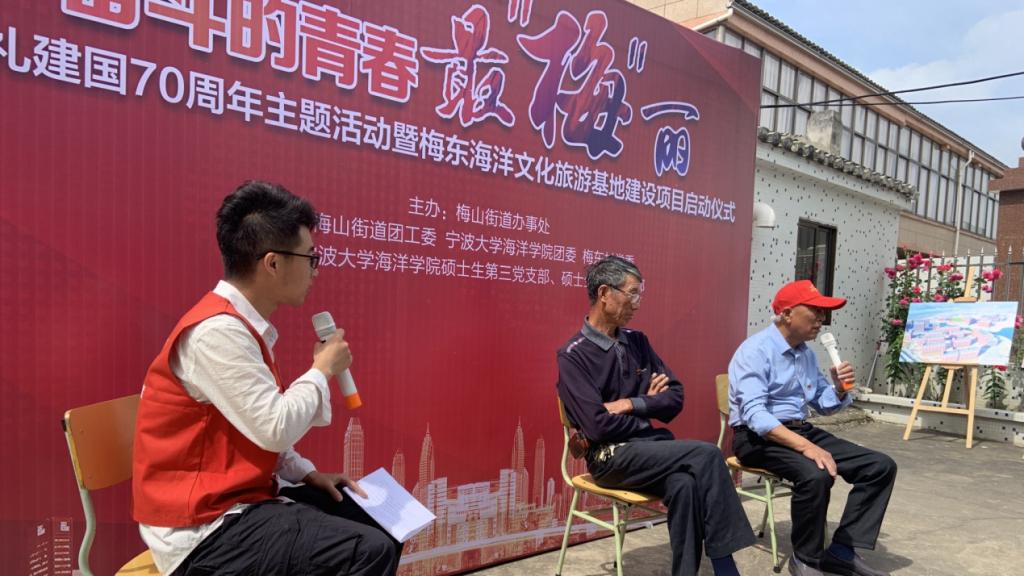 首先,学生义工主持采访五位梅东村党团干部,五位干部介绍了梅东村的发展历史,特别是新中国成立以来老一辈党员艰苦奋斗、无私奉献建设梅东村的感人事迹,梅东村也从20世纪40年代的落后贫穷蜕变为现在村风文明、富裕美丽的社会主义新农村;梅东村党团干部与麻豆成人
