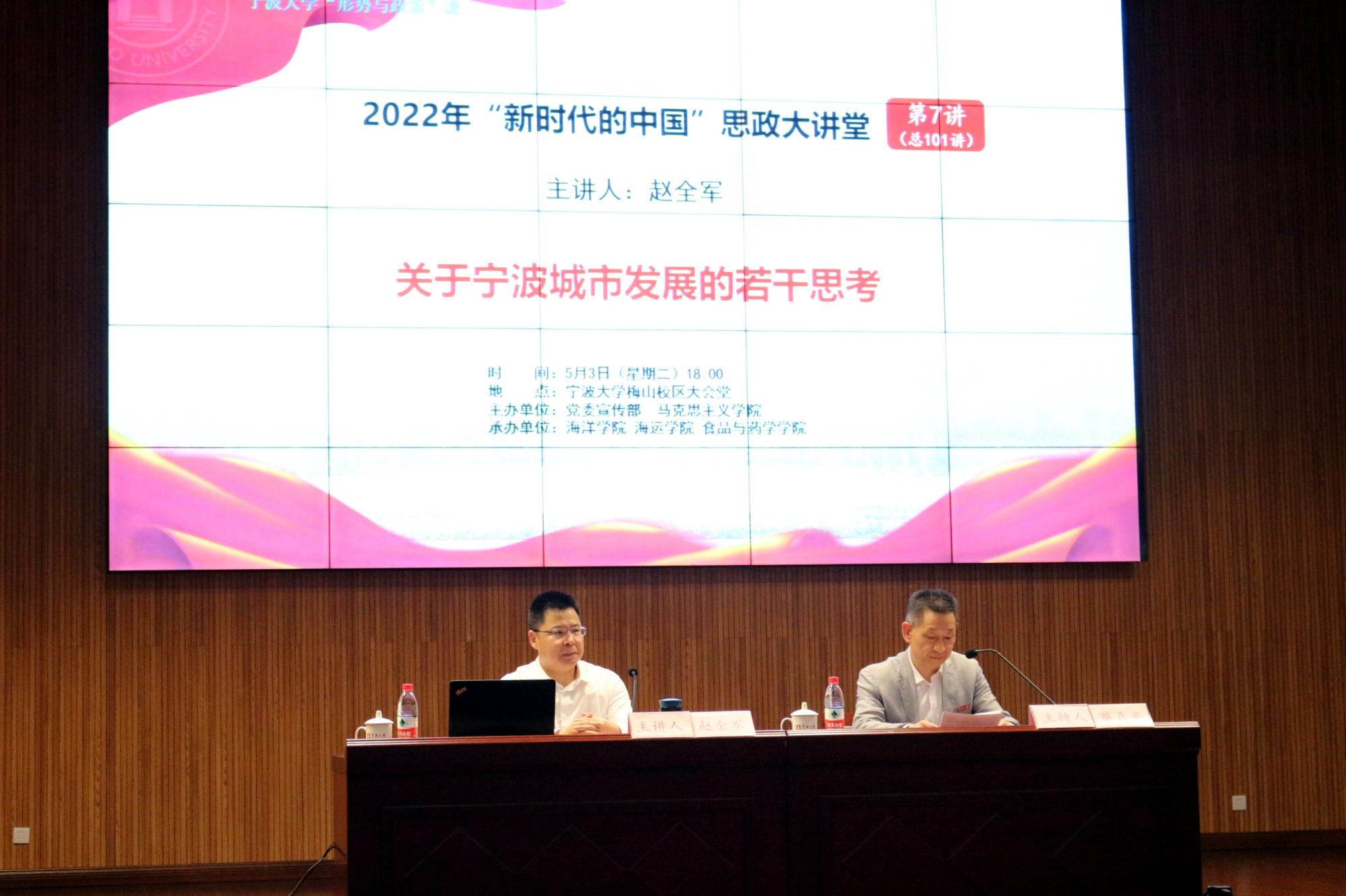赵全军从陆上宁波、海上宁波、海外宁波三方面介绍了宁波的基本情况,从“实力宁波、活力宁波、魅力宁波、给力宁波”四角度向同学们展示了宁波深厚的历史底蕴与强劲的经济发展动力。同时他深入浅出地阐述了新时代宁波的发展形势和面临的国内外环境变化,指出宁波当前发展突出面临的“三大难”挑战,提出做好“三大抓手”发展新思路。赵全军对梅山校区青年学子寄予了殷切的期望,他希望新时代青年要主动融入宁波这座魅力城市,鼓励同学们为宁波建设成全球海洋中心城市贡献自己的青春与智慧。