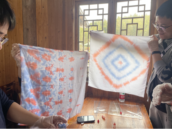午后时光,大家围坐下来开始了丝巾扎染活动。在老师的指导下,认识了解扎染,扎花,染色。随意一扎、一染,呈现了每一条丝巾独一无二的个性和气质。