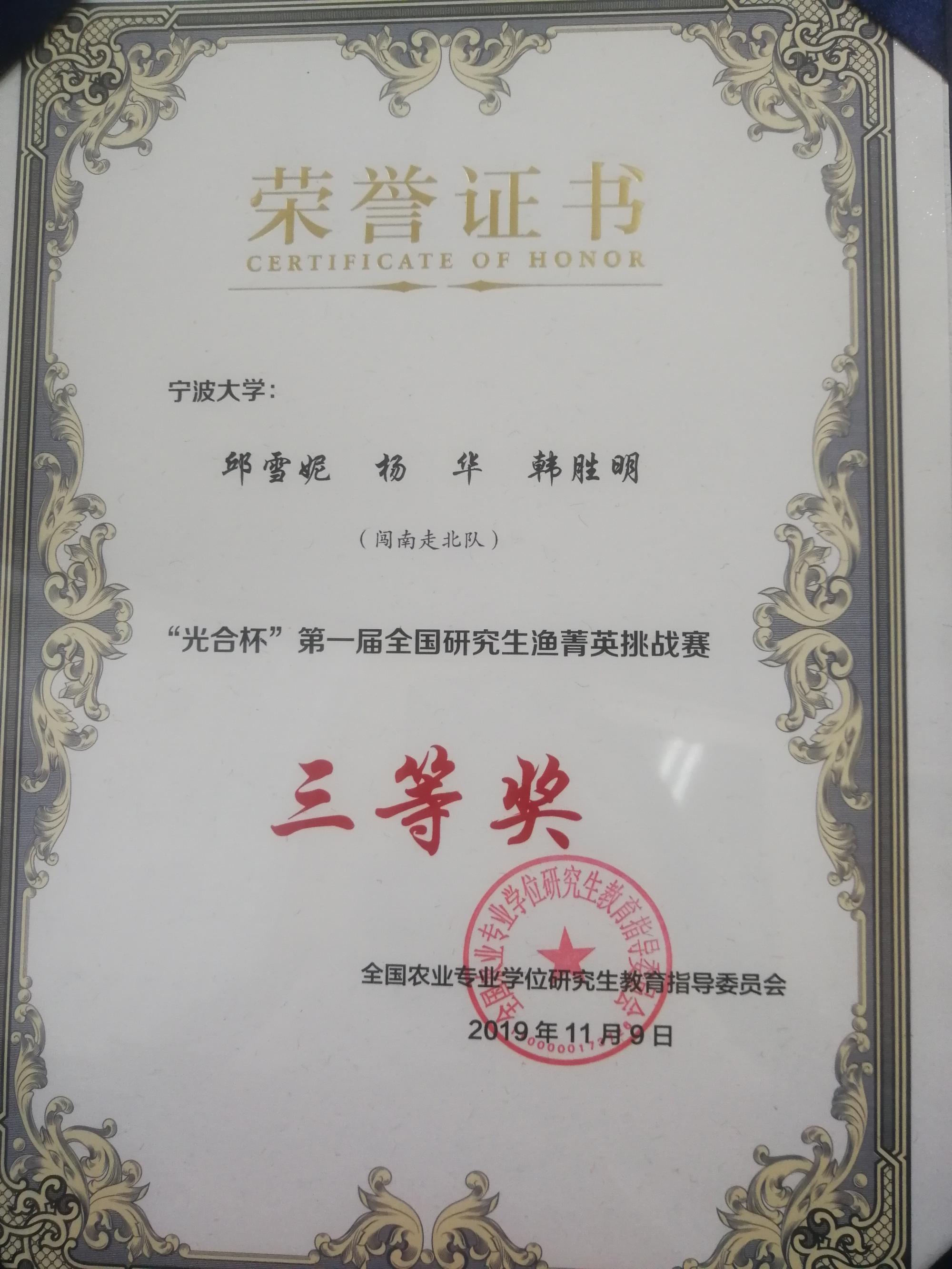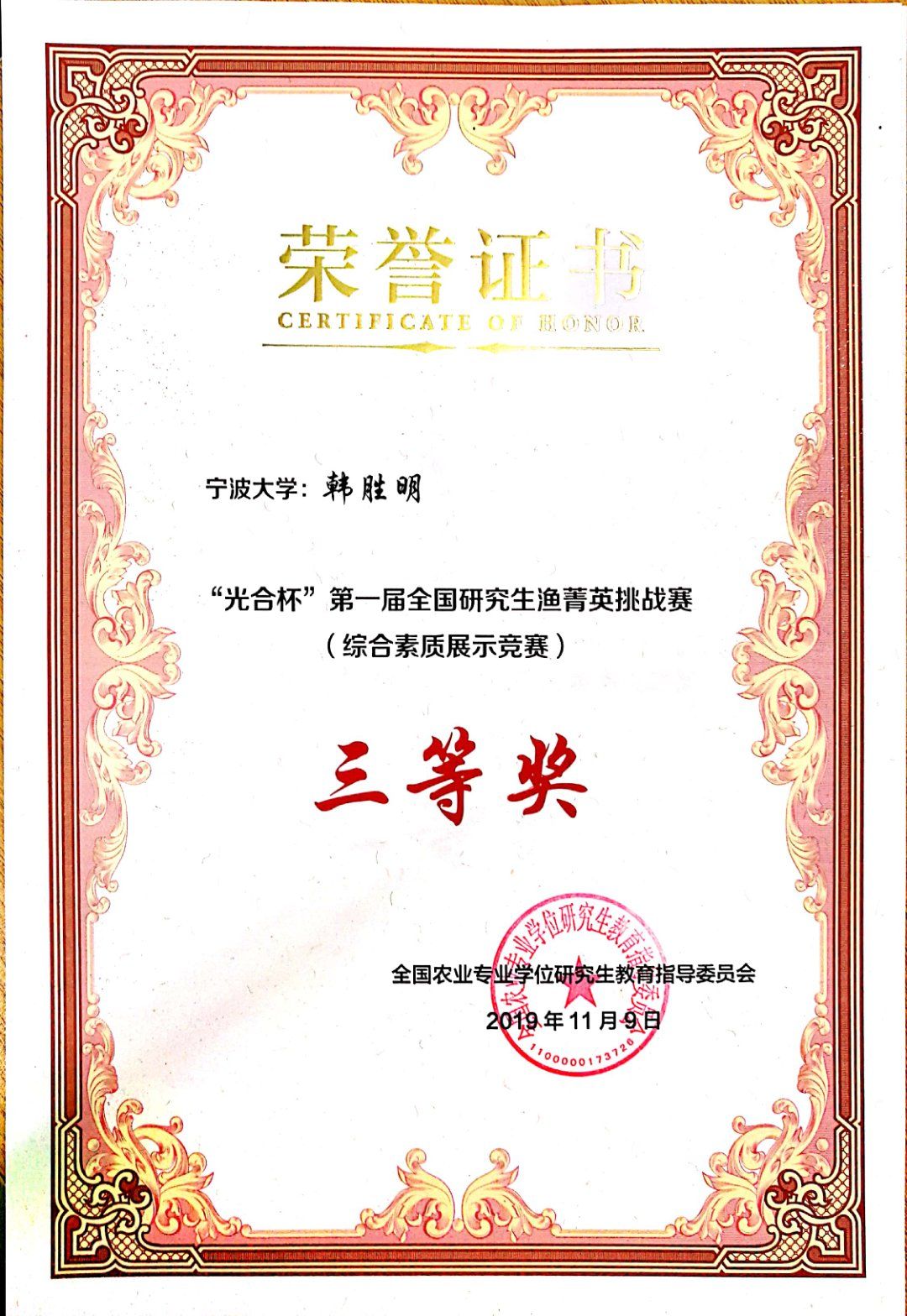 麻豆成人 +“光合杯”第一届全国研究生渔菁英挑战赛 三等奖 韩胜明 个人