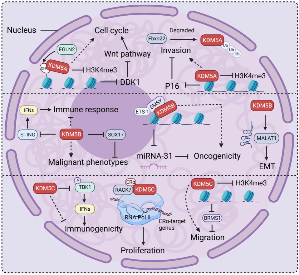 乳腺癌是全世界最常见的恶性肿瘤,也是导致女性死亡的主要癌症,发病率在不断升高,迫切需要探明乳腺癌发病的生物学机制。KDM5蛋白通常作用于转录激活标志的组蛋白H3K4me2/3上,能使其去甲基化从而抑制转录的发生。KDM5还通过非去甲基化依赖的方式参与调控多种生物学过程。异常的KDM5蛋白表达特别是其中的KDM5A、KDM5B和KDM5C与乳腺癌进展密切相关,主要表现为促进癌细胞的增殖、迁移、耐药、干细胞特性、血管生成、免疫逃避和代谢重塑等。多种靶向KDM5蛋白的抑制剂已经被开发出来,一些抑制剂在体内外的研究中展现出良好的抗乳腺癌活性,治疗的生物学分子机制也被逐渐阐明。