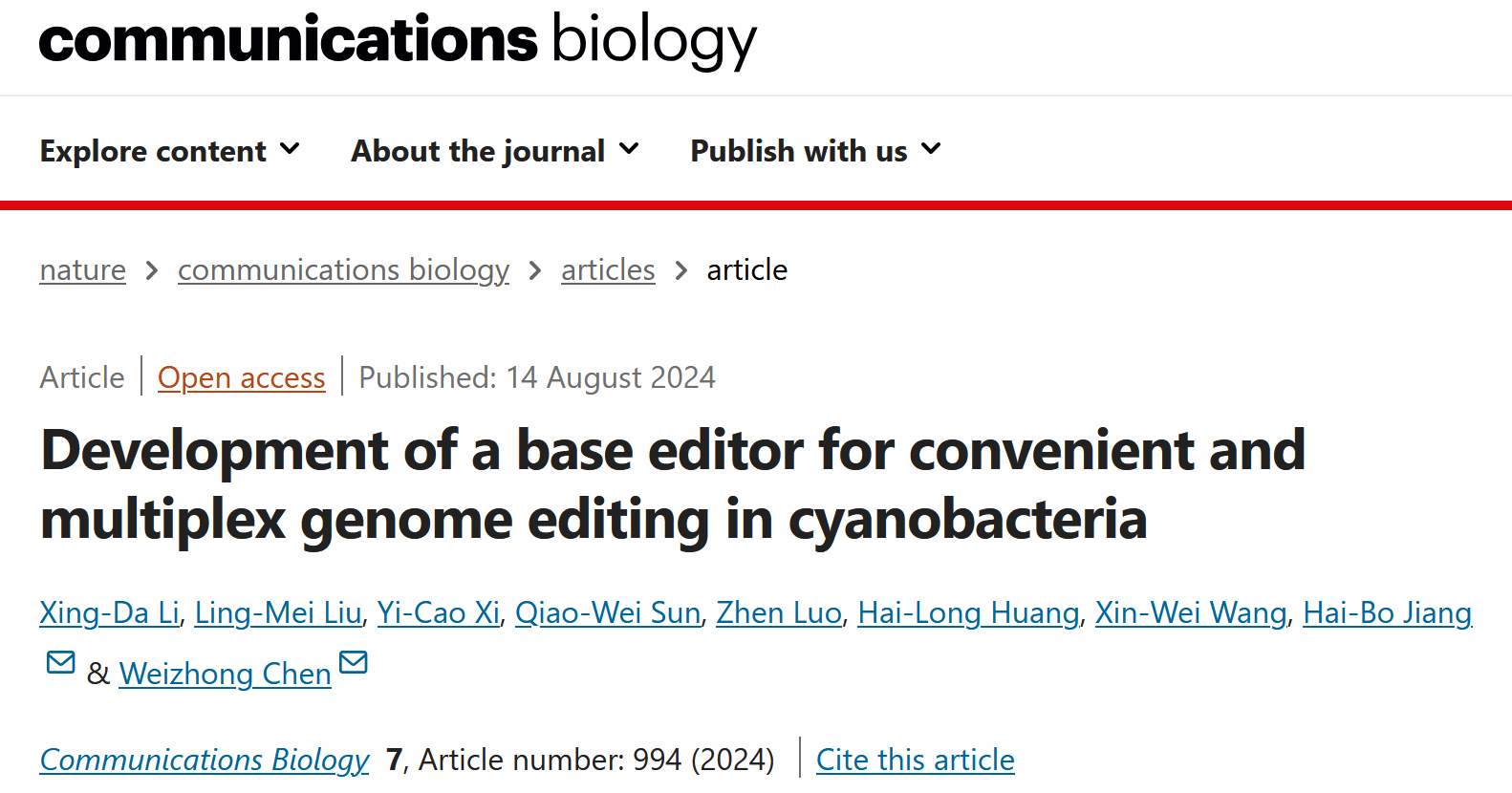 姜海波教授团队在蓝藻中开发了一种新型的CRISPR基因编辑技术。该成果以“Development of a base editor for convenient and multiplex genome editing in cyanobacteria”为题,发表在Nature出版集团旗下的生物学知名期刊《Communications Biology》上(图1)。