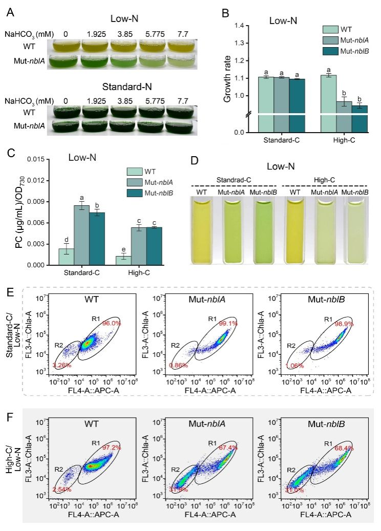 姜海波教授课题组研究发现,海洋蓝藻——聚球藻PCC 7002在受到氮限制时,通过降解藻胆体为细胞提供氮源,但藻胆体的降解必需有外界碳源的补充才会发生。当隔绝外界碳源进入时,藻胆体不会发生降解(图1)。只有当细胞摄入过多的碳、较少的氮时,聚球藻才会启动藻胆体降解相关基因(nblA、nblB等)的表达并降解藻胆体,维持胞内具有活性的碳和氮的浓度平衡。失去藻胆体降解能力的聚球藻突变株维持胞内碳/氮平衡的能力下降,导致突变株在高碳/氮比条件下的生长较野生型显著受阻(图2)。转录组结果发现,与野生型相比,突变株在高碳/氮比条件下无法通过降解藻胆体调控碳/氮平衡,转而采用下调氮利用途径和二氧化碳浓缩机制(CCM)来应对,因此表现为细胞不失绿、但生长和光合作用受抑制的生理表型(图3)。