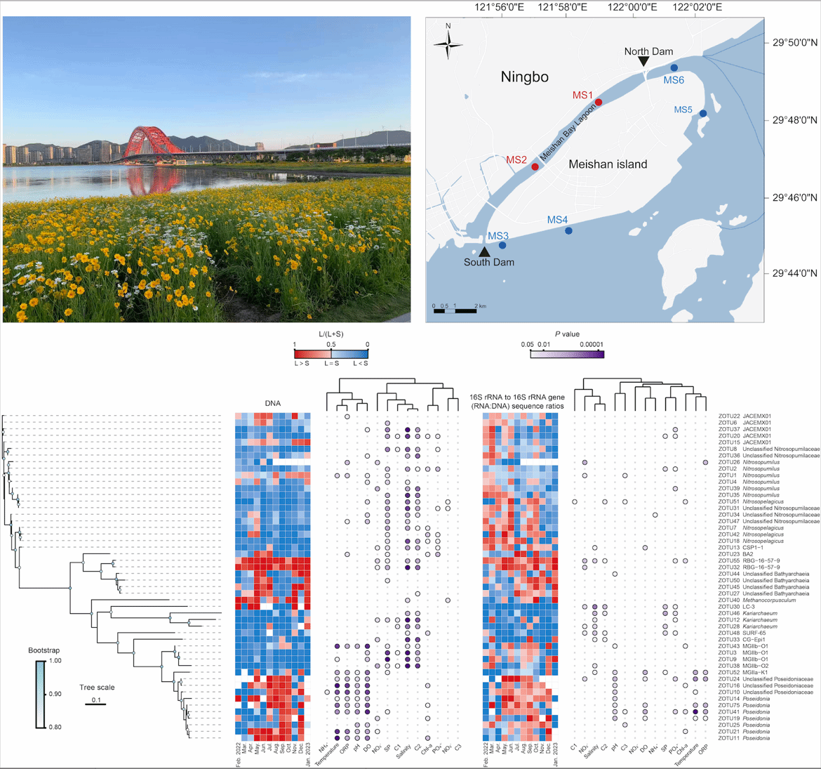 近岸人工潟湖工程被广泛用于提升防汛能力、改善水质及增强生态系统服务功能,然而其对微生物群落——尤其是海洋古菌这一关键功能类群——的影响尚缺乏深入认识。该研究通过周年时间序列观测,结合16S rRNA基因及其转录本的高通量测序,系统比较了人工潟湖与毗邻海域中浮游古菌的多样性、群落构建过程及潜在活性。研究团队发现,人工潟湖工程显著改变了梅山湾的水环境特征,形成具有相对低盐、低浊及独特溶解有机质组成的水体条件。这种由潟湖工程及其维护所引入的水团效应,成为驱动古菌群落构建的主导因素。与邻近海域相比,潟湖内古菌的α多样性整体更高,其影响程度超过自然季节波动所引起的变化。此外,潟湖内古菌群落表现出更高的物种周转速率和更快的季节性轮回。在强烈的季节性演替背景下,潟湖对古菌群落组成的影响仍贯穿于不同分类水平,尤其体现在Poseidoniales类群内部不同种群间的空间生态位分化。整体上,潟湖工程对关键古菌类群分布的影响,较对其活性的影响更为广泛和显著(图2)。